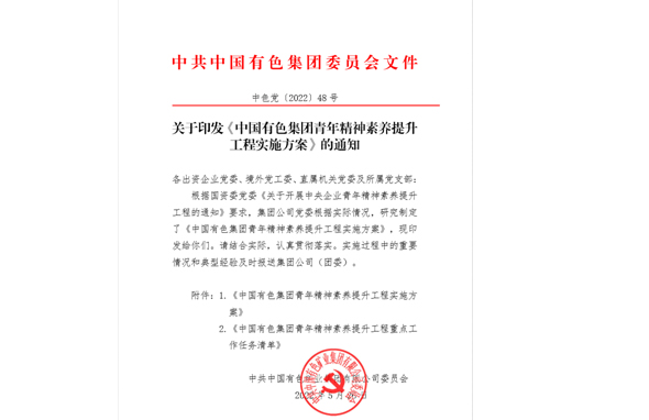 根據(jù)國(guó)資委黨委《關(guān)于開展中央企業(yè)青年精神素養(yǎng)提升工程的通知》要求,集團(tuán)公司黨委根據(jù)實(shí)際情況,研究制定了《中國(guó)有色集團(tuán)青年精神素養(yǎng)提升工程實(shí)施方案》。