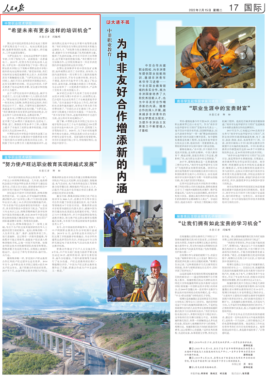 2022年2月15日出版的《人民日報》刊發(fā)題為《中非職業(yè)教育——為中非友好合作增添新的內(nèi)涵(大道不孤)》文章,對中國有色集團推動我國職業(yè)教育“走出去”情況進行了報道(鏈接:http://paper.people.com.cn/rmrb/html/2022-02/15/nw.D110000renmrb_20220215_1-17.htm)。以下為報道全文: