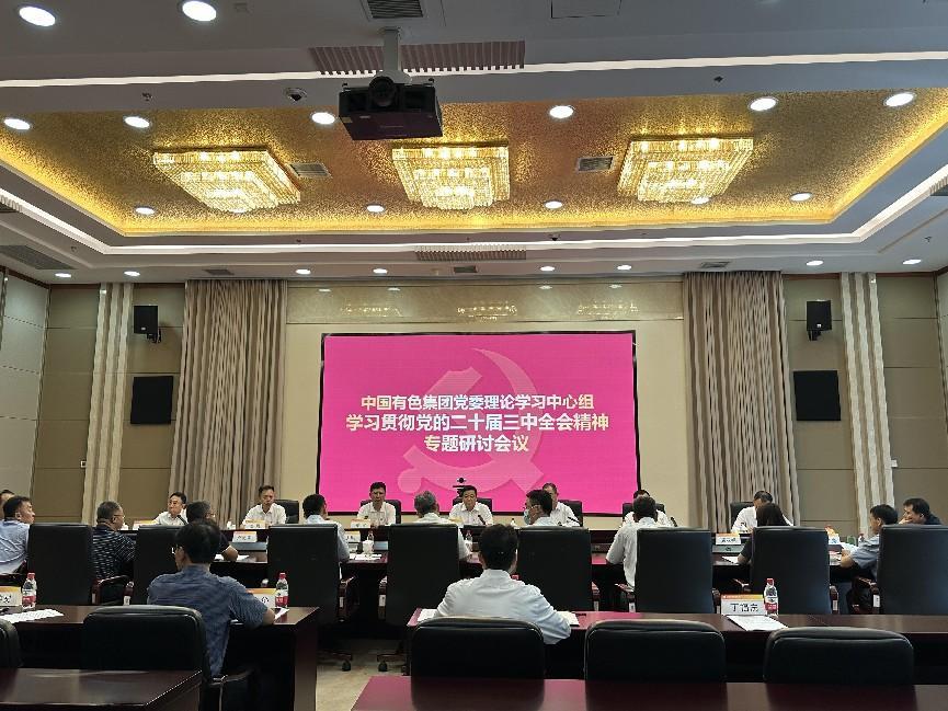 根據(jù)黨中央關(guān)于學(xué)習(xí)貫徹黨的二十屆三中全會(huì)精神的重要部署,以及國(guó)務(wù)院國(guó)資委黨委有關(guān)工作要求,8月30日,中國(guó)有色集團(tuán)黨委召開(kāi)理論學(xué)習(xí)中心組黨的二十屆三中全會(huì)精神專(zhuān)題學(xué)習(xí)研討會(huì)議,集中學(xué)習(xí)黨的二十屆三中全會(huì)精神,重溫習(xí)近平總書(shū)記對(duì)集團(tuán)公司三次重要指示批示精神,就集團(tuán)公司全面抓好貫徹落實(shí),加快推動(dòng)高質(zhì)量發(fā)展開(kāi)展集中研討。中國(guó)有色集團(tuán)黨委書(shū)記、董事長(zhǎng)主持學(xué)習(xí),領(lǐng)學(xué)三中全會(huì)精神重點(diǎn)內(nèi)容并作研討重點(diǎn)發(fā)言,黨委副書(shū)記、總經(jīng)理領(lǐng)學(xué)習(xí)近平總書(shū)記重要指示批示精神并作研討重點(diǎn)發(fā)言,集團(tuán)公司領(lǐng)導(dǎo)班子成員參加學(xué)習(xí)研討。