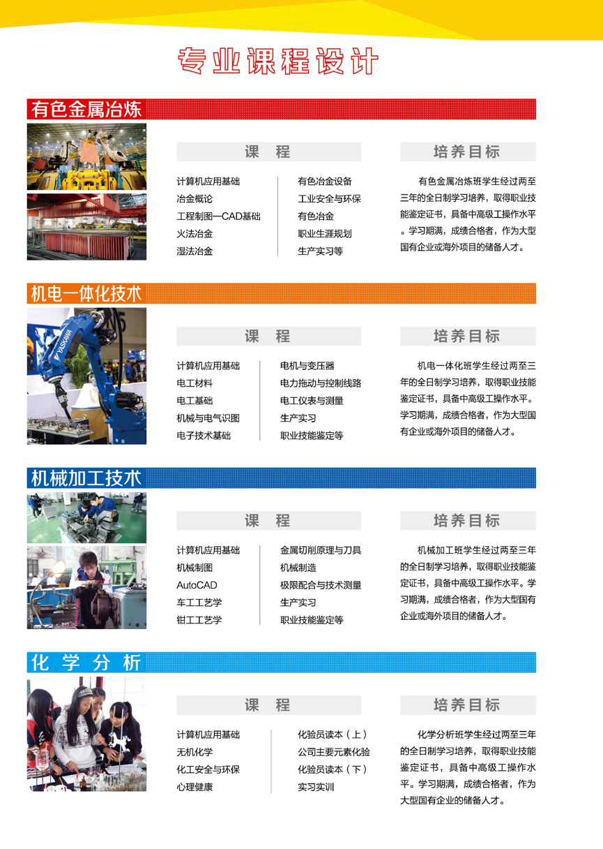 有色金屬冶煉、機電技術應用、選礦技術、工業(yè)分析與檢驗、機械加工技術