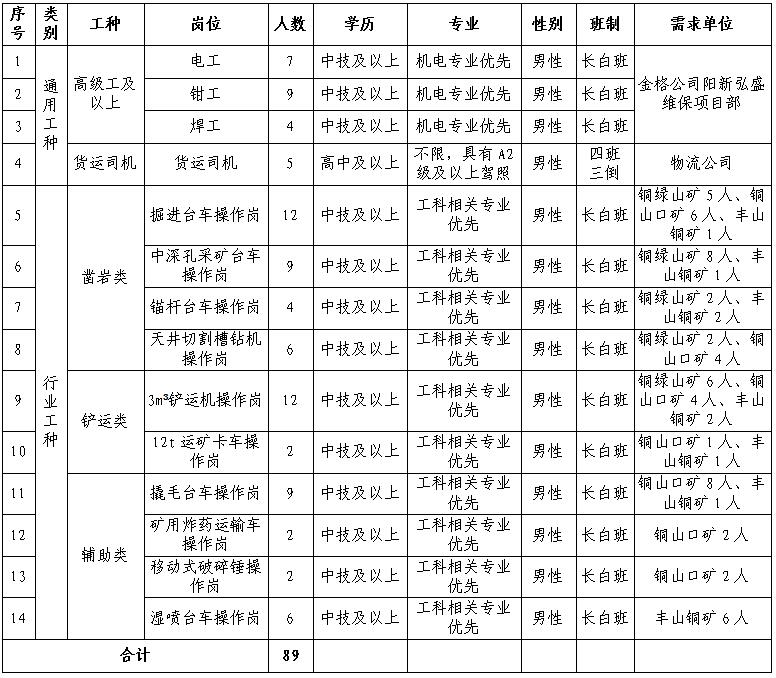 ????學(xué)歷年齡要求:技能人才年齡要求在30周歲以內(nèi),如有冶煉、礦山行業(yè)相關(guān)崗位工作經(jīng)驗、對口崗位中級工及以上職業(yè)資格證書、大學(xué)本科及以上學(xué)歷或復(fù)退軍人,年齡可放寬至35周歲,原則上男性優(yōu)先。高級工及以上技能人才年齡要求原則上不超過40周歲,特別優(yōu)秀者年齡可放寬至45周歲。